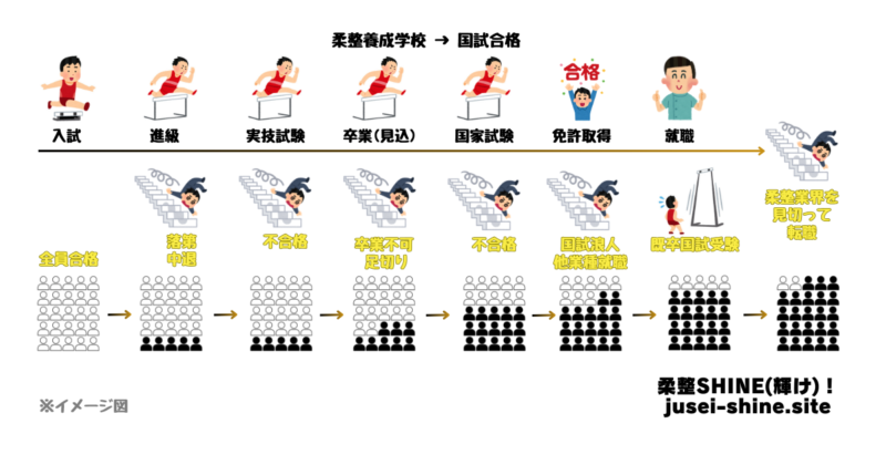 柔整養成学校に入学してから国家試験合格までに立ちはだかるハードルをその脱落率と共に挙げてみます。