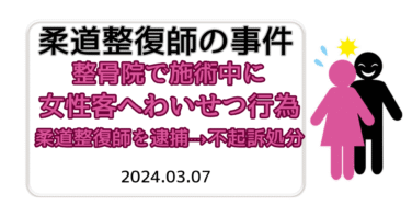 柔整報道 【柔整報道】[性犯罪] 整骨院で施術中に女性へわいせつ行為疑い 柔道整復師を逮捕 容疑認めたが不起訴処分 倉敷/岡山 2024.03.07 各種メディアから配信された柔道整復師が関わる報道です。配信元で実名・施術所名が明記されていても当サイトでは伏せて引用する場合があります。※不起訴処分となった事案のため個人が特定出来ないよう伏せて記述しました。報道2024年3月に大手メディア... 2025/03/28 柔整報道